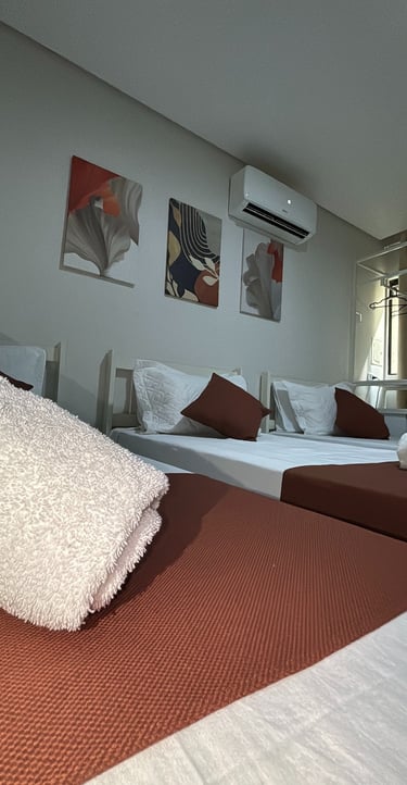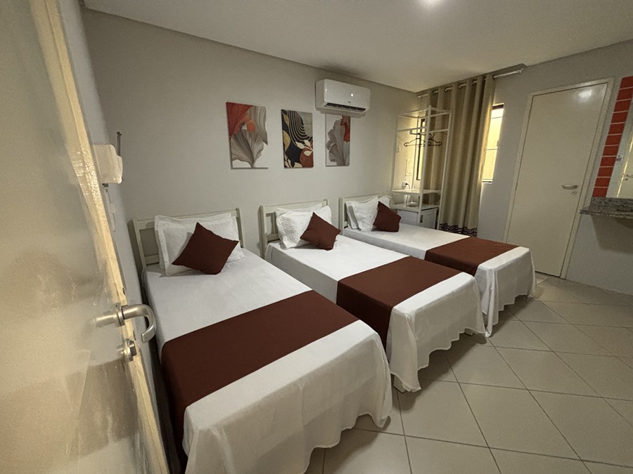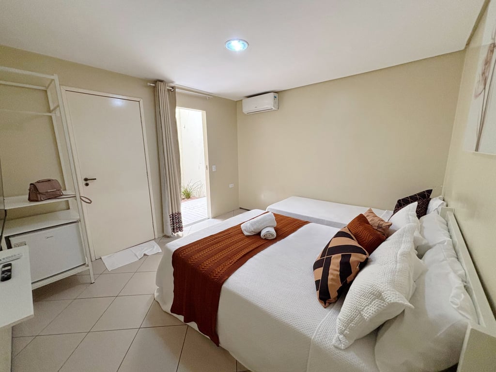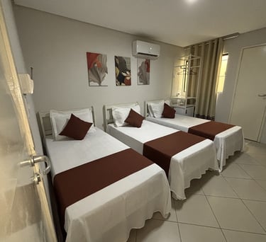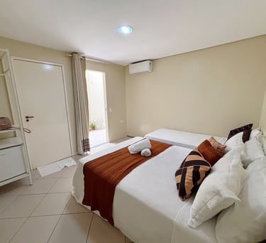 Um refúgio de conforto e elegância. Nosso quarto combina decoração refinada, iluminação acolhedora e todos os detalhes pensados para o seu bem-estar. Ideal para relaxar e recarregar as energias com estilo. Desfrute desse ambiente agradabilíssimo, climatizado e camas confortáveis para até 3 pessoas, perfeitas para a sua estadia a trabalho ou lazer.
